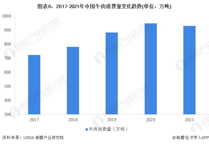 据USDA统计数据显示,从消费量来看,2019年,我国牛肉消费量超过巴西,成为仅次于美国的全球第二大牛肉消费市场。数据显示,2020年我国牛肉消费量为948.6吨。结合2021年我国牛肉产量及进出口规模估算,2021年,我国牛肉消费量约为930万吨。