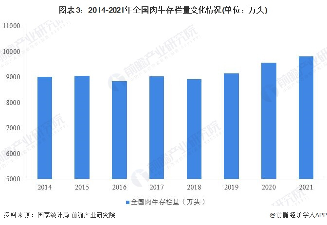 据国家统计局统计数据显示,2014年以来,我国肉牛存栏量整体呈现震荡趋势,截至2021年,全国肉牛存栏9817万头,同比增长2.7%。