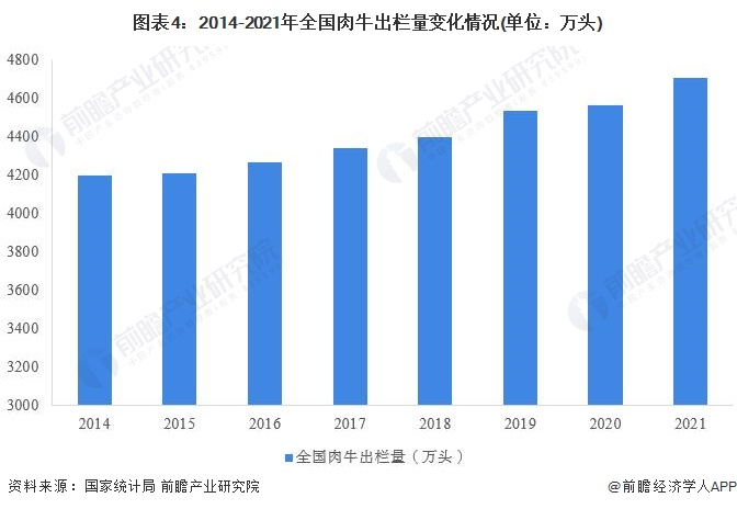 据国家统计局统计数据显示,2014年以来,我国肉牛出栏量整体呈现平稳增长的趋势,截至2021年,国内肉牛出栏4707万头,比上年增加142万头,增长3.1%,创近八年新高。