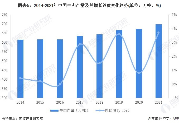 据国家统计局统计数据显示,2014年以来,我国牛肉产量整体呈现上升趋势,2021年全国牛肉产量698万吨,同比增长3.7%。