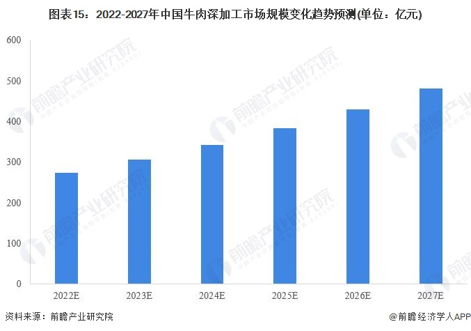 在多重政策推动下,预计未来几年我国牛肉深加工市场规模将进一步提升,随着疫情的逐渐消退全球牛肉供应将恢复正常,近年来的牛肉价格高位运行也将回落,前瞻预计未来几年,我国牛肉深加工市场规模将保持10%左右增速平稳增长。到2027年,全国牛肉深加工市场规模将达到481亿元。