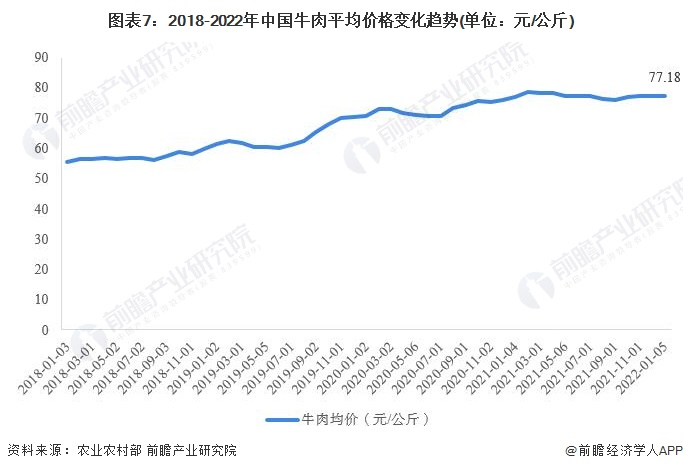 据农业农村部最新统计数据,2022年1月,全国牛肉平均价格77.18元/公斤,较上年期末价格走势较为平稳,整体保持高位运行。