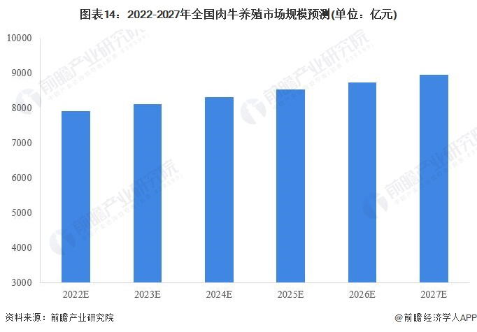 2021年,农业农村部发布《“十四五”全国畜牧兽医行业发展规划》,规划中明确指出,到2025年,牛肉自给率保持在85%左右;牛肉产量将稳定在680万吨左右;牛规模养殖比重达到30%。由此可见未来几年,我国国内肉牛养殖出栏率将进一步提升,以提升国内牛肉供给,从而实现牛肉自给率的提升,前瞻预计未来几年我国肉牛养殖行业市场规模仍将保持低速增长,到2027年,全国肉牛养殖行业市场规模将达到8953亿元。