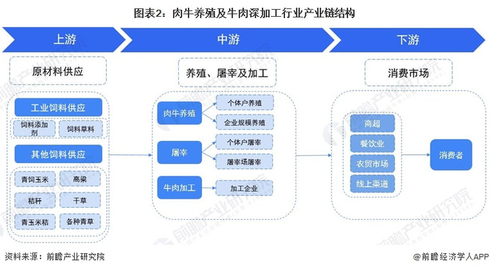 肉牛行业的上游为饲料及添加剂、遗传育种等企业,中游由各类养殖,屠宰及加工企业组成,下游主要面向消费端。本文所研究的肉牛养殖及牛肉深加工产业属于肉牛行业产业链的中游核心产业。