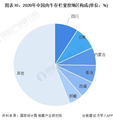 据国家统计局统计数据显示,2020年,四川省牛肉存栏量为880.3万头,占全国肉牛总存栏量的9.21%;云南和内蒙古分列二三位,肉牛存栏量分别为858.8万头和671.1万头,分别占全国总量的8.98%和7.02%。