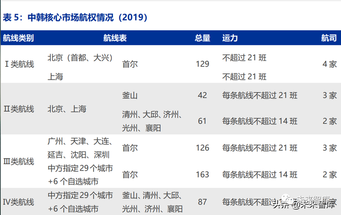 2019 年 3 月 13 日-15 日,中韩民航代表团在南京举行双边航空会谈。韩国国土海洋 部 (MOLIT)的文件公布了双边航权的变化。航权调整按区重新划分,客运航班总量从此前 的 548 班增加至 608 班,货运航班从 44 班增加至 54 班。航权数据显示中韩核心市场(北 京、上海、首尔等)航权仍有限制,未来航权限制将保护航空公司合理竞争。