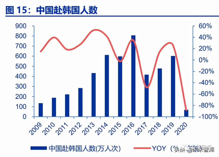 2018 年访日中国内地游客 838 万,2019 年中国赴日旅客达到 959 万人次,达到近年 赴日数据最高值。2016 年访韩中国内地游客 806 万,到近年赴韩数据最高值。随后受外部 事件影响,中国赴韩人数有所减少,在疫情前的 2019 年访韩中国内地游客 602 万。