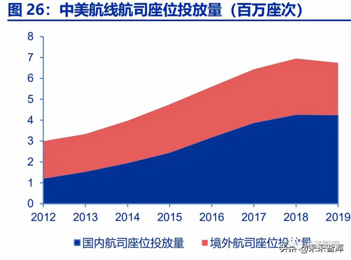 在中欧航线上 2019 年中国航空公司座位投放相较 2014 年增长 112.8%,而境外航空 公司仅增长 26.9%。在中国-北美航线上 2019 年中国航空公司座位投放相较 2014 年增长 117.4%,而境外航空公司仅增长 23.6%。