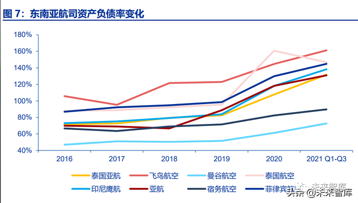 遭受疫情冲击后,国际航线上的损失使得东南亚地区航空公司的资产负债表变得非常 脆弱,除新加坡航空以外,其余缺乏政府支持的航空集团均处于极度困难的境地。包括泰 国亚航、菲律宾航空、印尼鹰航在内的东南亚航司,2020 年资产负债率比 2019 年平均高 30 个百分点,相较疫情前负债比例大幅上升。截止到 2021 年前三季度,泰国亚航、飞鸟航空、泰国航空、印度鹰航、菲律宾航空等 多家航司的资产负债率已超过 130%,公司风险进一步扩大,多家航司偿债能力下降,已 经接近公司清偿能力的极限。