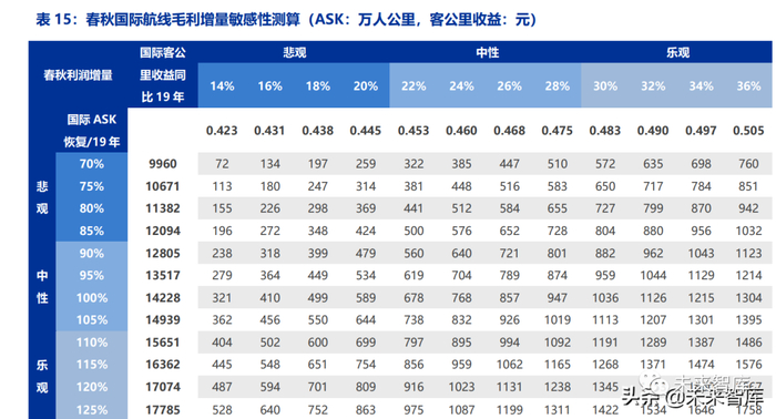 我们预期后疫情时代,春秋航空国际 ASK 可能恢复至 2019 年 70%-125%的水平。在 最乐观的情形下,考虑到主要竞争对手运力水平的减少、春秋航空在主要国际执飞地区的 市占率扩大以及国际出行需求的恢复,春秋航空国际航线 ASK 可恢复至疫情前的 125%, 国际航线客公里收益能够达到 0.505 元,同比疫情前增长 36%,在国际航线上同比 19 年 实现 17.58 亿的毛利增量。