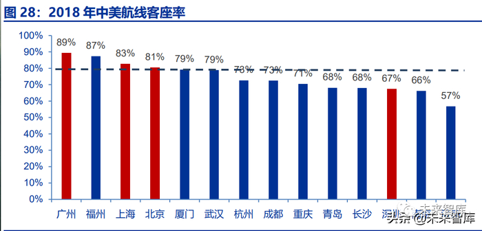 以 2018 年的中美航线为例,各城市中美航线平均客座率为 79.8%,而只有广州、福 州、上海和北京始发航线客座率高于平均,绝大多数二线城市中美航线客座率都低于 75%。
