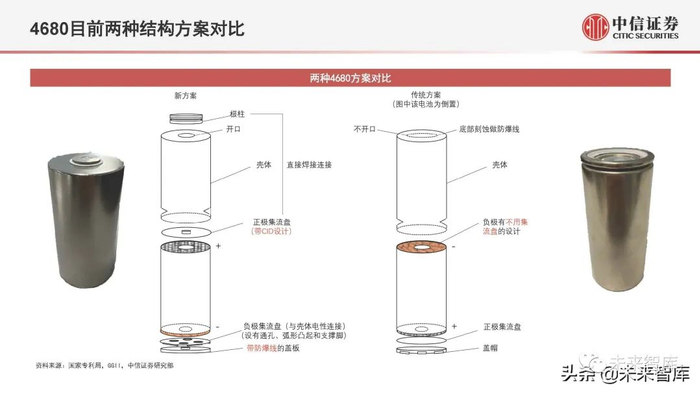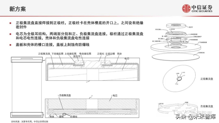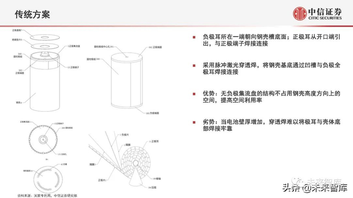 传统方案:负极耳所在一端朝向钢壳槽底面;正极耳从开口端引 出,与正极端子焊接连接 ;采用脉冲激光穿透焊,将钢壳基底通过凹槽与负极全 极耳焊接连接;优势:无负极集流盘的结构不占用钢壳高度方向上的 空间,提高空间利用率 ;劣势:当电池壁厚增加,穿透焊难以将极耳与壳体底 部焊接牢靠。