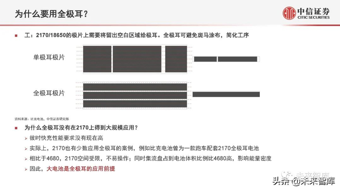 彼时快充性能要求没有现在高;实际上,2170也有少数应用全极耳的案例,例如比克电池曾为一款跑车配套2170全极耳电池 ;相比于4680,2170空间受限,不易操作;同时集流盘占到电池体积比例比4680高,影响能量密度 ;因此,大电池是全极耳的应用前提。
