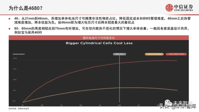 为什么是4680?46:从21mm到46mm,系增加单体电池尺寸可摊薄非活性物质占比,降低固定成本和BMS管理难度,46mm之后热管 理难度增加,降本收益为负,故46mm即为增大电芯尺寸后降本程度最大的最优点 ;80:80mm的高度相较此前70mm有所增加,可在径向散热不恶化的情况下增大单体容量。一般因各家底盘设计而异, 例如宝马采用4695。