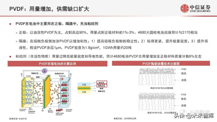 PVDF在电池中主要用在正极、隔膜中,充当粘结剂。正极:以油溶性PVDF为主,占到高达90%,用量占到正极材料的1%-3%。4680大圆柱电池高镍预计与2170相当 ;隔膜:在接触负极侧加涂PVDF以增加粘性;1)提高硅碳负极粉的稳定性;2)贴得更紧,提升能量密度;3)提升保 液性。假设PVDF涂层1μm,PVDF密度为1.8g/cm³,1GWh用量约20吨 ;粘结剂(非活性物质)用量过降低能量密度和导电性能,预计4680电池PVDF总用量增加至正极材料质量分数6%左右。(报告来源:未来智库)