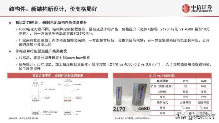 相比2170电池,4680电池结构件价值量提升 。4680各家方案不同,结构件定制化程度高,目前还是非标产品,价格提升(壳体+盖帽:2170 <2元 vs 4680 目前10元 左右),另一方面竞争格局比方形和2170优化;厂家采购意愿更趋于壳体和盖帽整套采购。一方面是非标品,合格供应商稀缺;另一方面主要系目前电池良率低,分开 采购增加不良率风险;