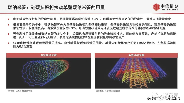由于硅碳负极材料的导电性能差,因此需要添加碳纳米管(CNT)以增加活性物质之间的导电性,提升电池能量密度;根据石墨烯片的多少,碳纳米管可分为单壁碳纳米管和多壁碳纳米管:多壁碳纳米管具有较高的刚性,而单壁碳纳米管 柔韧性强、长径比更高、有效添加量仅为0.1%,可有效解决硅碳电池在充放电过程中导致的体积膨胀和裂缝问题 ;天奈科技目前是全球碳纳米管的龙头企业,公司已布局硅碳负极的导电浆料技术,可转债方案落地,产能扩张将加速推 进;此外,化工企业如石大胜华、炭黑龙头黑猫股份等企业也在积极布局碳管生产 ;4680电池带来硅碳负极用量的提高,将带动单壁碳纳米管的用量,单壁CNT粉体价格约为1300万元/吨,在负极添加比 例为0.1%左右。
