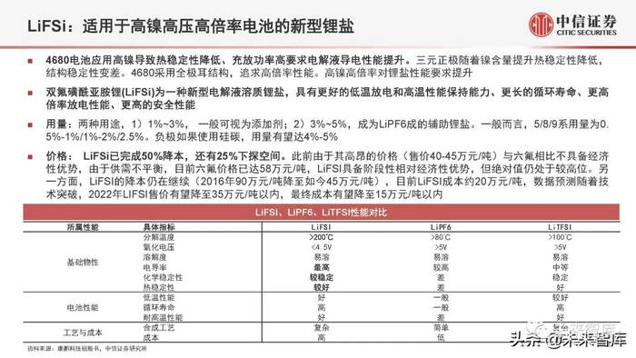 680电池应用高镍导致热稳定性降低、充放功率高要求电解液导电性能提升。三元正极随着镍含量提升热稳定性降低, 结构稳定性变差。4680采用全极耳结构,追求高倍率性能。高镍高倍率对锂盐性能要求提升。