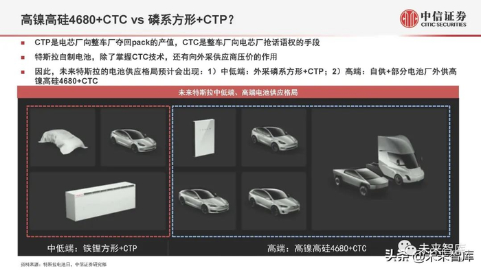 CTP是电芯厂向整车厂夺回pack的产值,CTC是整车厂向电芯厂抢话语权的手段 ;特斯拉自制电池,除了掌握CTC技术,还有向外采供应商压价的作用 ;因此,未来特斯拉的电池供应格局预计会出现:1)中低端:外采磷系方形+CTP;2)高端:自供+部分电池厂外供高 镍高硅4680+CTC。