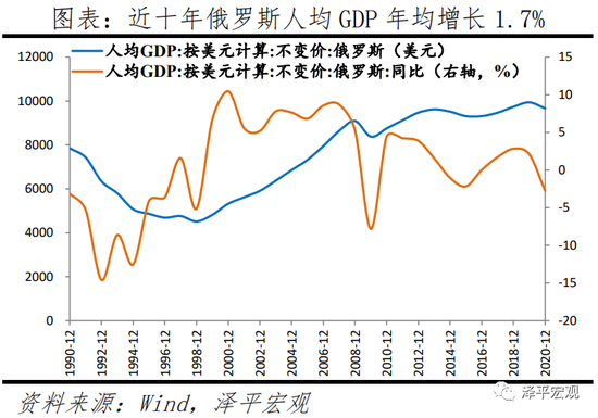 俄罗斯产业结构较为单一,制造业体量仍在、但产业链不完整,资源型行业占比较高。截至2021年9月,俄罗斯采掘业增加值占GDP约13%的比重;制造业占比16%。2009年-2019年,俄罗斯GDP年均增长2%;人均GDP年均增长1.7%。2019年消费、投资和出口对GDP的拉动率约为2.48%、0.54%以及-0.54%。
