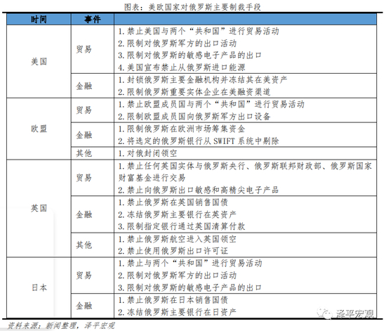 俄乌冲突以来,美欧对俄罗斯发出制裁,涉及金融、能源、科技、军事等领域。主要有:1)金融方面,部分俄罗斯银行被SWIFT系统剔除,但能源相关银行被排除在外;2)科技方面,美欧停止向俄罗斯出口高精尖电子产品;3)军事方面,不再对俄罗斯军方出口战争必需的技术及设备;4)能源方面,美国宣布禁止从俄罗斯进口能源;5)除了政府组织,美欧各大企业、社会组织等迫于政治和舆论压力发动对俄罗斯制裁。