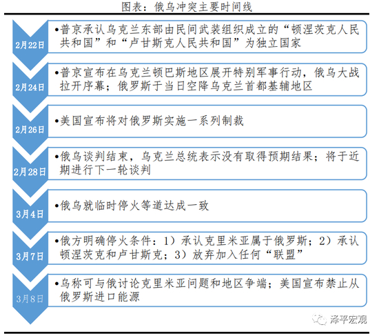 莫斯科时间2月24日清晨,俄罗斯总理普京发表全国讲话,宣布在乌克兰东部地区发起特别军事行动。随后媒体报道俄军已经开始进攻乌克兰,俄乌冲突愈演愈烈。截至3月8日,乌克兰总统泽连斯基称可讨论俄方提出的停战条件。不确定性仍存。