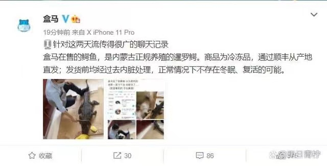 对此,盒马回应称,针对这两天流传得很广的聊天记录盒马在售的鳄鱼,是内蒙古正规养殖的暹罗鳄。商品为冷冻品,通过顺丰从产地直发;发货前均经过去内脏处理,正常情况下不存在冬眠、复活的可能。