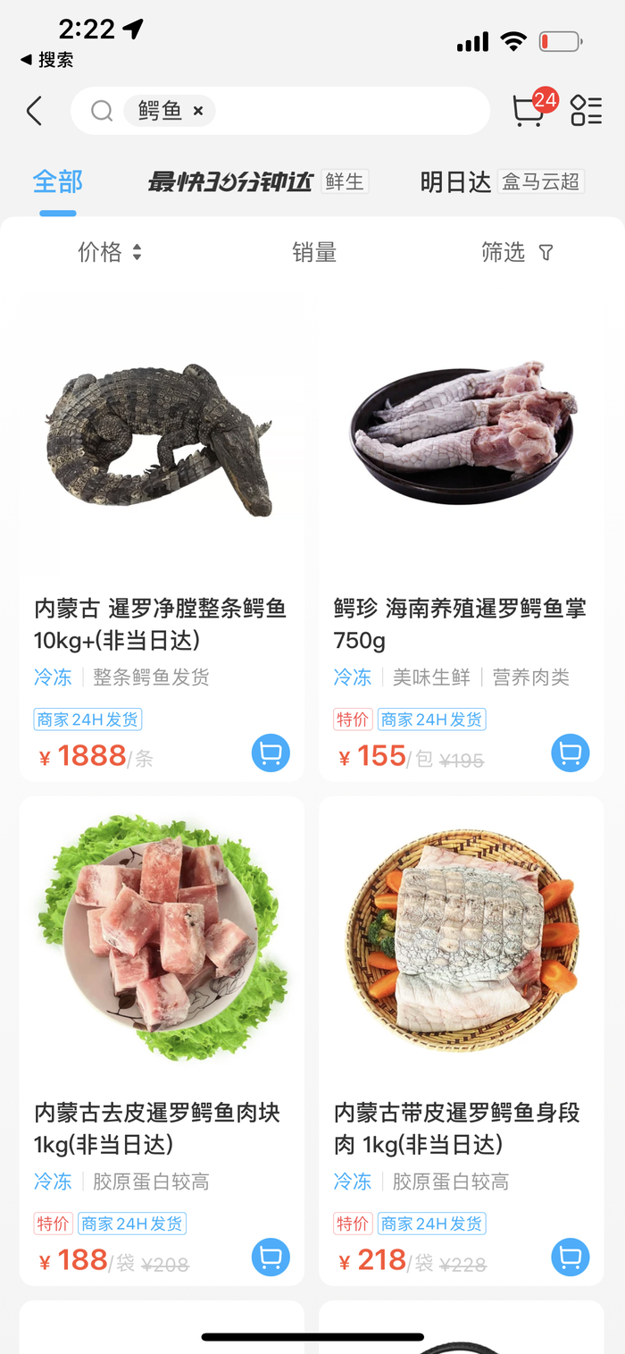 记者打开盒马app看到,输入“鳄鱼”搜索,跳出4条相关商品,其中3条是鳄鱼肉。有分开卖的鳄鱼掌、身段肉、鳄鱼肉块,以及整条鳄鱼。