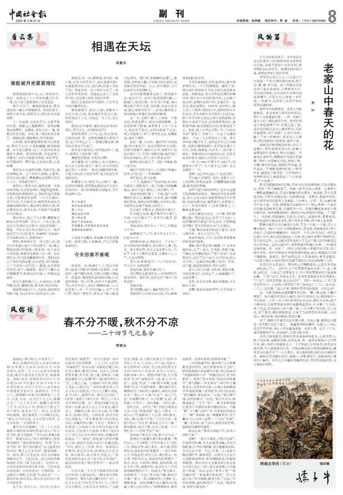 据西汉大儒董仲舒《春秋繁露·阴阳出入上下》阐释:“至于仲春之月,阳在正东,阴在正西,谓之春分。春分者,阴阳相半也,故昼夜均而寒暑平……至于仲秋之月,阳在正西,阴在正东,谓之秋分。秋分者,阴阳相半也,故昼夜均而寒暑平。”春分、秋分,不仅阴阳相半,昼夜均等,而且不冷不热,寒暑平均,是北方人一年四季里最舒服的日子。俗话说:“春分春分,百草萌动。”又说:“春分地气通,解冻日日增。”春分一到,日暖风和,兰芽吐玉,柳眼挑金。诚如南朝大诗人谢灵运《登池上楼》之诗句所云:“初景革绪风,新阳改故阴。池塘生春草,园柳变鸣禽。”