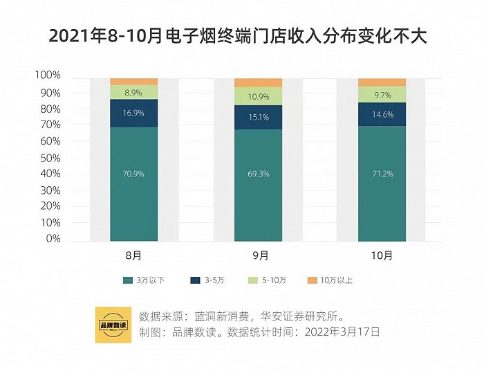 华安证券数据显示,从终端门店经营情况看,2021年上半年《烟草专卖法》征求意见稿中“电子烟等新型烟草制品参照本条例中关于卷烟的有关规定执行”监管公开后, 4~10 月受品牌商加速渠道扩张、门店密度加大、渠道内卷等影响,电子烟终端门店经营情况环比持续下滑。Q3 门店下滑趋势略有放缓,预计电子烟正式参考卷烟监管后,Q4 电子烟门店经营状况将环比改善。