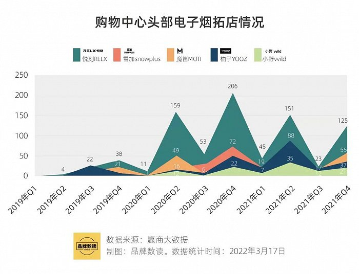 从2020年开始,悦刻、雪加、魔笛、柚子等品牌在寸土寸金的购物中心里抢占山头。2020年第四季度,悦刻开店数一度超过200,柚子、雪加和魔笛在2021年第一季度也开出了超80多家门店。