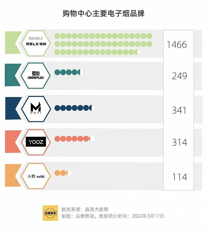 不仅在数量上占优势,在线下渠道的承租能力上,悦刻也显示出超过其他品牌的底气。赢商大数据显示,悦刻RELX、魔笛MOTI、柚子YOOZ、雪加snowplus和小野vvild是购物中心中的头部品牌,悦刻以1466家门店的数量领跑,第二名魔笛340多家,在量级上不敌悦刻。柚子、雪加和小野以300多家、200多家和100多家的门店数量陪跑。在一个购物中心里,常常可以看到三个电子烟品牌打对台。