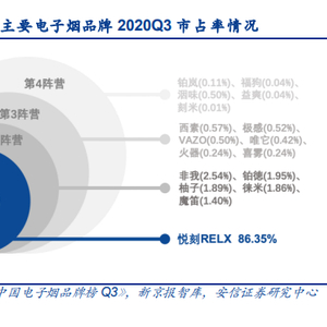招股书显示,在2019年悦刻就以48%的市占率位居电子烟市场首位,到了2020年9月末市占率上升至62.6%。《中国电子烟品牌榜Q3》显示,悦刻是绝对的寡头,市占率超过86%,剩下的品牌瓜分不足15%的市场。