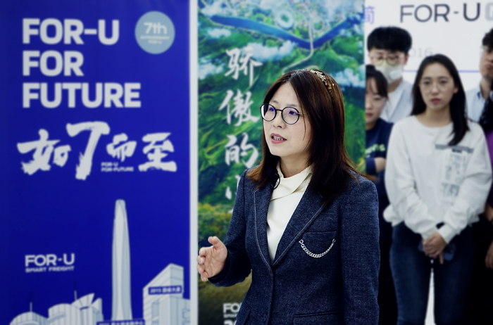 3月18日福佑卡车迎来7周年庆,单丹丹向公司全员作“OPENDAY”分享 图片来源:企业供图