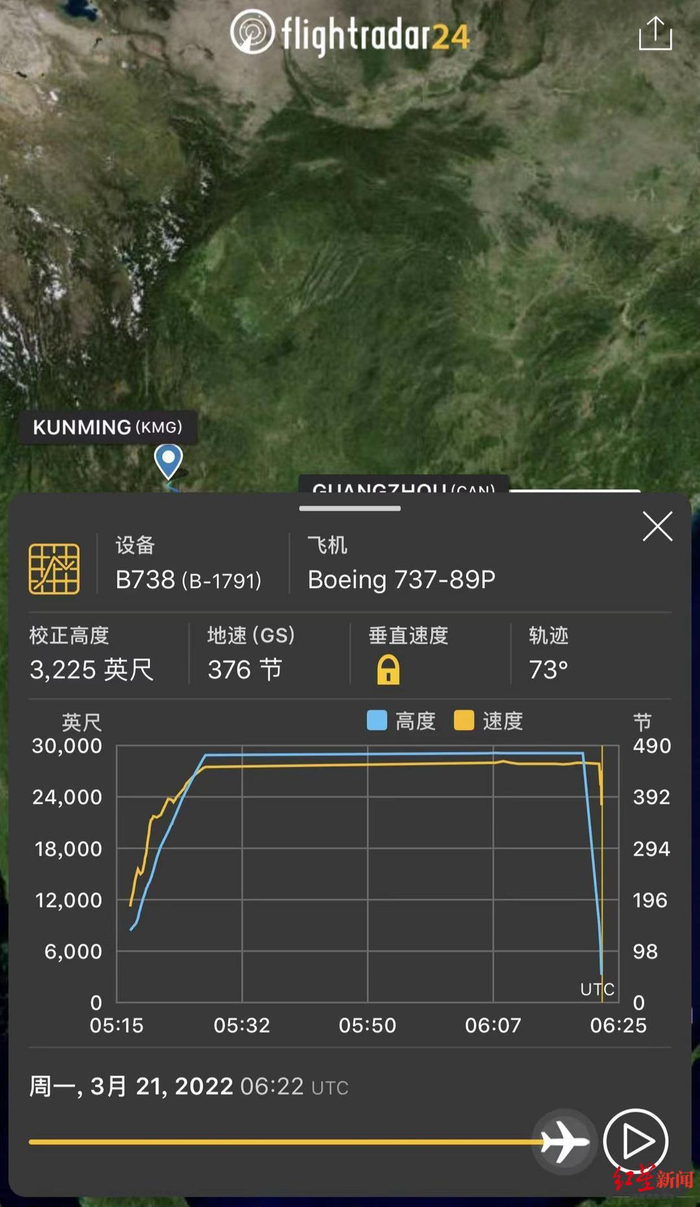 红星新闻记者从航空专业软件flightradar24查询显示,该航班于北京时间14:16分起飞,15:22分坠落。