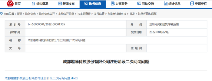 趣睡科技2021年7月在创业板过会,证监会官网显示,今年1月29日对其提出注册阶段二次问询。