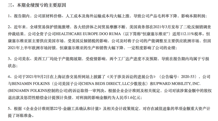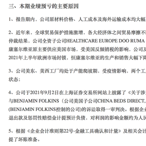 梦百合指出,本期业绩预亏的主要原因为,原材料价格、人工成本及海外运输成本均大幅上涨,导致产品毛利率下降;全球贸易保护措施激增,各大经济体之间贸易摩擦不断对产销产生负面影响;公司在美东、美西工厂处于产能爬坡期,受疫情影响工厂达产进度不及预期,属于亏损状态等。