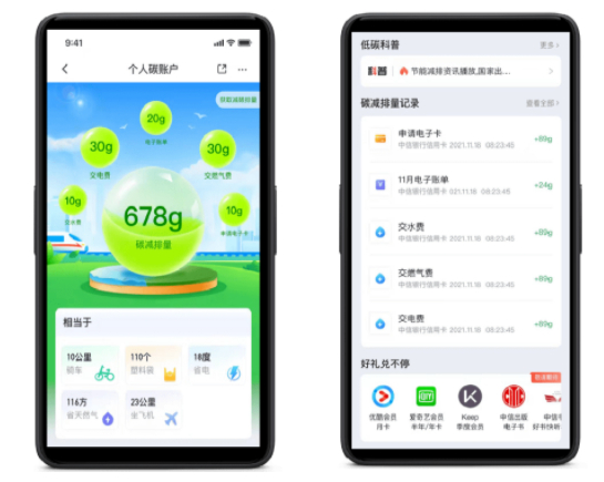 首批用户体验者通过登录APP便能立即在线开通个人碳账户,获取关联相关个人的碳减排量。据悉,目前内测版已经上线了生活缴费、申请电子信用卡、开通电子账单等低碳行为的碳减排量核算。公开版上线后,还将包含绿色出行、二手物品回收等更丰富的绿色低碳生活场景。