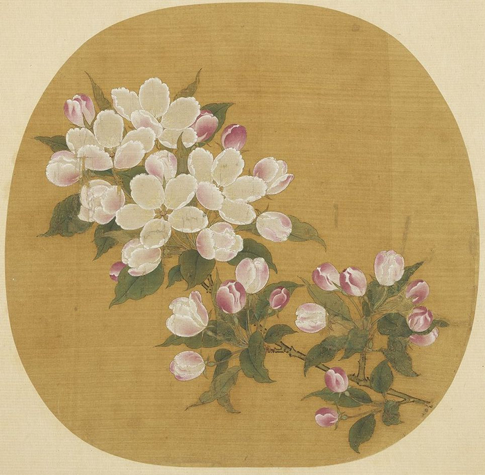 本幅选自“宋元集绘”册,画折枝海棠一枝,或盛开、或含苞。花之设色,以白粉为底,罩以胭脂,娇柔可人。