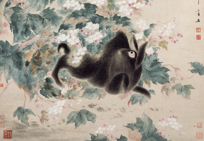 此图结构新奇,笔法将宋人工笔花鸟之细腻工致与写意花鸟之秀逸洗练相结合,敷色活泼。海棠以胭脂及白粉点染,树叶颜色用石青、石绿,其间又有微带白黄色的大叶,颜色浓丽湿润,黑兔的墨色变化更为微妙丰富,浓淡之间表现出柔软疏松的质感,并与树木花卉的暖色调和谐统一,使整幅画面洋溢着花香鸟语的初春气氛。清 恽珠 《海棠蛱蝶图》扇页