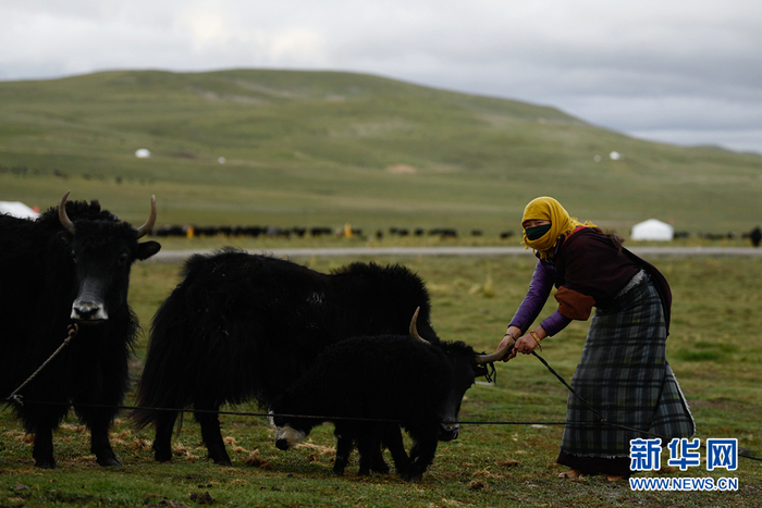 在果洛州玛沁县当洛乡贡龙村的夏季草场上,牧民在拴牦牛。(资料图)新华社记者 张龙 摄