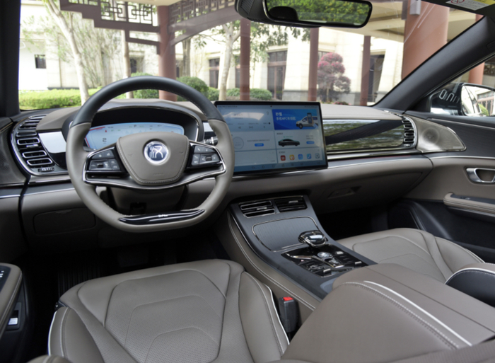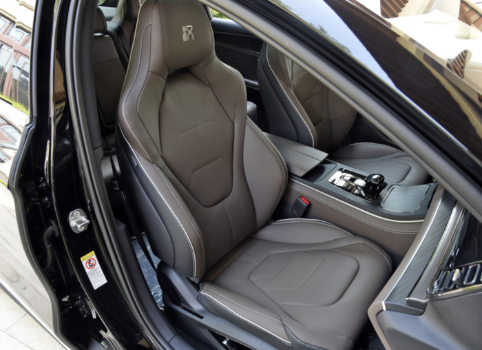 进入车内,比亚迪汉DM-i车内采用了一个全新的配色,大量的咔色调能给人一种稳重舒适的氛围感。在中控台表面、中央扶手区域,以及门板处都采用了拉丝铝塑的材质包覆,凸显品位。除了液晶仪表、中控悬浮式大屏、电子挡把这些原有的设计元素外,新车对座椅的升级比较大。新车座椅换成了桶式运动座椅,头枕与靠背之间还有个镂空处理,座垫采用打孔处理,头枕部位还采用了“汉”刺绣工艺,靠背宽大,不管是座椅承托力还是支撑性都很到位,坐上去给人一种很舒适宽大的感觉。