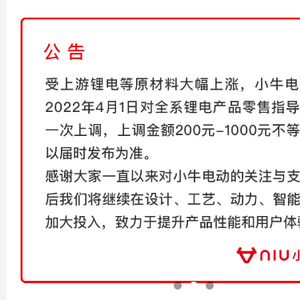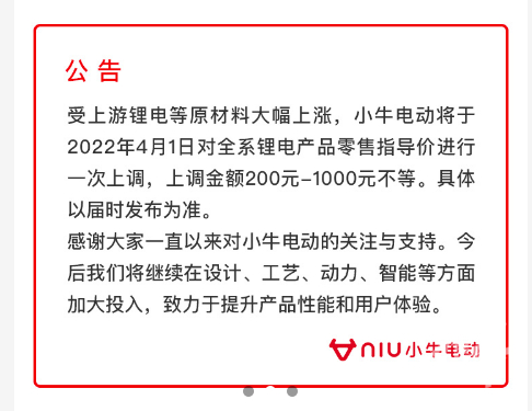 今天上午,小牛电动发布公告称,受上游锂电等原材料价格大幅上涨影响,小牛电动将于4月1日起对全系锂电产品零售指导价进行一次上调,上调金额200-1000元不等,具体以届时发布为准。