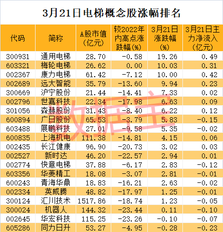 受消息刺激,电梯概念今日新晋为热门题材。证券时报·数据宝统计,电梯指数今日涨幅超5%,九成概念股收盘时股价飘红。梅轮电梯、康力电梯、远大智能3股涨停,通用电梯盘中触及20cm的涨停板,收盘涨幅19.26%。从成交量来看,超六成电梯概念股量比放大,通用电梯、康力电梯、沪宁股份、广日股份等量比高达3倍以上,通用电梯量比11.39倍排在首位。
