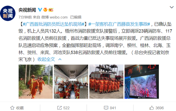 一架从昆明飞往广州的东航波音737客机在广西梧州失事,机上载有132人,目前首批救援队伍已经到达现场。