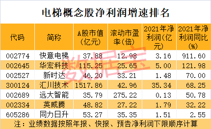 数据宝统计,目前布局电梯业务的20只A股中,按照年报、快报、预告净利润下限计算,共7股2021年净利润同比增长,其中快意电梯、华宏科技净利润预计翻倍增长。快意电梯净利润增速最高,去年公司主营电梯产品产销量及营业收入同比大幅增长,加上一次性转让中和居“三旧改造”房地产项目,公司预计2021年净利润为3.16亿元至3.26亿元,同比增长9.12倍至9.44倍。(数据宝 梁谦刚)