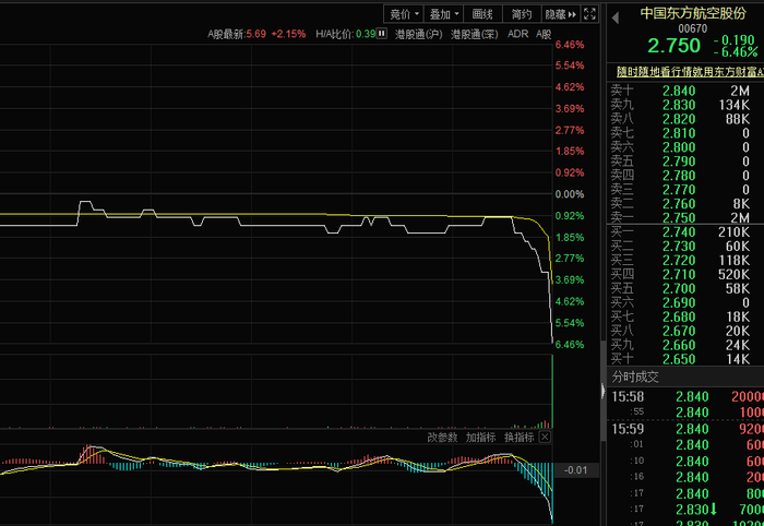 受事故影响,港股中国东方航空股份临近尾盘时股价直线跳水,收盘时跌幅达到6.46%。