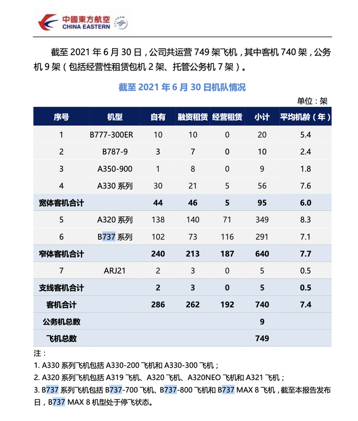 东航2021年半年报显示,截至2021年6月30日,共有291架737,平均机龄7.1年。但半年报中也明确,统计的737系列飞机包括 B737-700 飞机、B737-800 飞机和 B737 MAX 8 飞机。