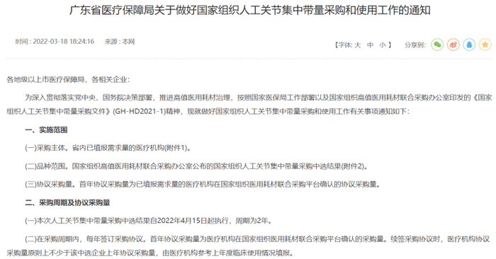 3月18日,根据广东省医疗保障局官网信息,广东此次共有330家医疗机构参与人工关节集采工作,包括公立医院和民营医院,采购产品范围为:人工髋关节、人工膝关节。全省首年采购总量36400套,预计年节约费用7.5亿元。