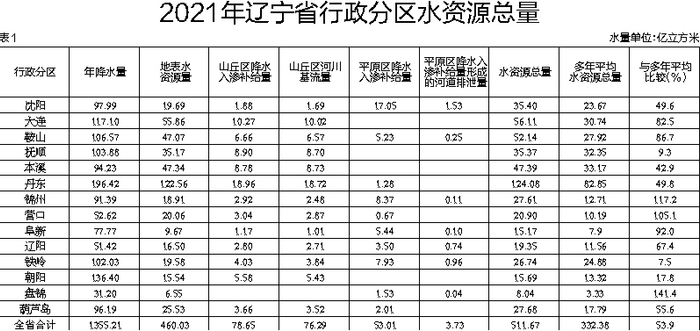 按行政区分析,全省14个市级行政区,水资源总量均大于多年平均值。比多年平均值多10%以下的为铁岭市和抚顺市,水资源总量分别为26.74亿立方米和35.37亿立方米;比多年平均值多10%~20%的为朝阳市,水资源总量为15.69亿立方米;比多年平均值多40%~50%的为本溪市、沈阳市和丹东市,水资源总量分别为47.39亿立方米、35.40亿立方米和124.08亿立方米;比多年平均值多50%~60%的为葫芦岛市,水资源总量为27.68亿立方米;比多年平均值多60%~70%的为辽阳市,水资源总量为19.35亿立方米;比多年平均值多80%~90%的为大连市和鞍山市,水资源总量分别为56.11亿立方米和52.14亿立方米;比多年平均值多90%~100%的为阜新市,水资源总量为15.17亿立方米;比多年平均值多100%以上的为营口市、锦州市和盘锦市,水资源总量分别为20.90亿立方米、27.61亿立方米和8.04亿立方米。